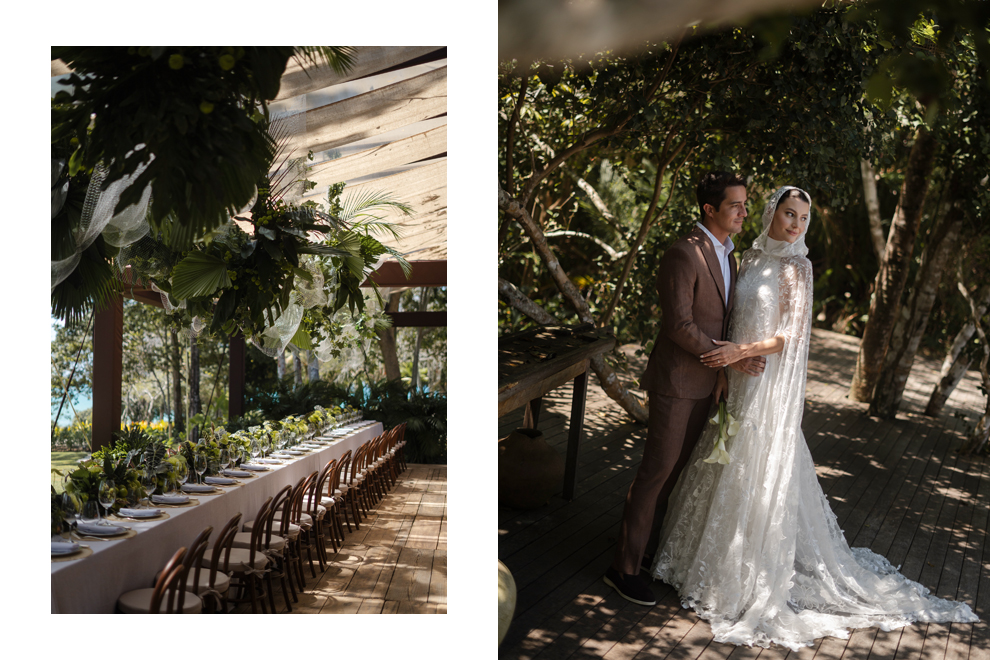 "Sempre sonhei em me casar de frente para o mar. Milagres me traz uma paz enorme, e já conhecia a Bisutti Milagres Casa do Marceneiro onde casamos, onde havia assistido...