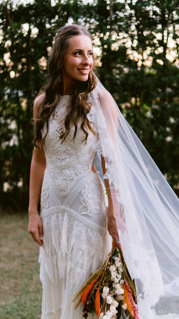 “Sabia que queria um vestido mais boho. Conhecia uma marca australiana e minha mãe e minha cunhada me ajudaram a encontrar algumas referências. Mas quando cheguei na Casamarela NoivasGuia de Fornecedores