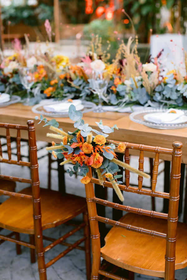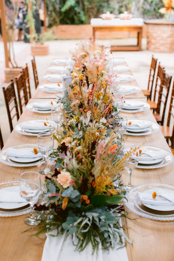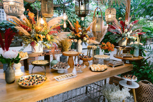 “Desde que decidimos casar, pesquisei ideias para a decoração, e o buquê foi a base para a escolha de todo o resto. Tivemos flores e folhas secas na decor, que foi assinada por Enfeita Decoração.”