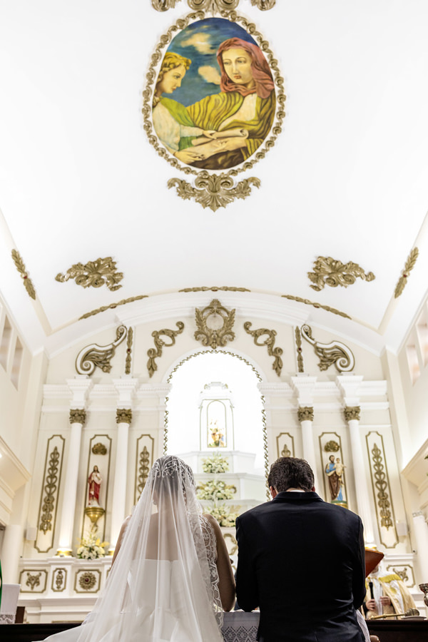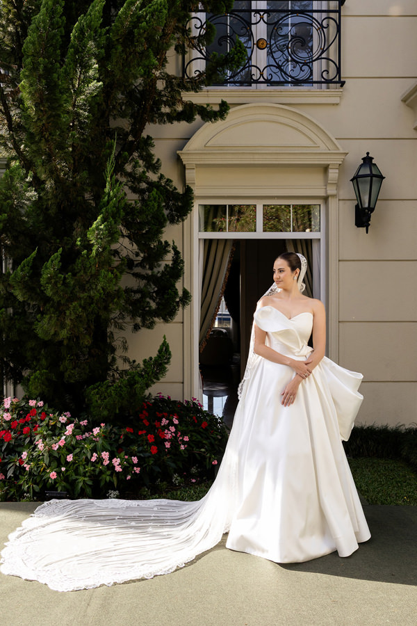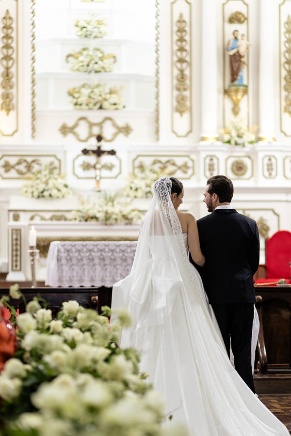 “Minha prima se casou no ano anterior usando um vestido sob medida da Eduarda Galvani, e fiquei encantada com o caimento perfeito do vestido nela. Após conversar com ela, tive certeza de que o meu vestido da cerimônia religiosa também precisava ser feito pela Duda, muito atenciosa e querida conosco.”