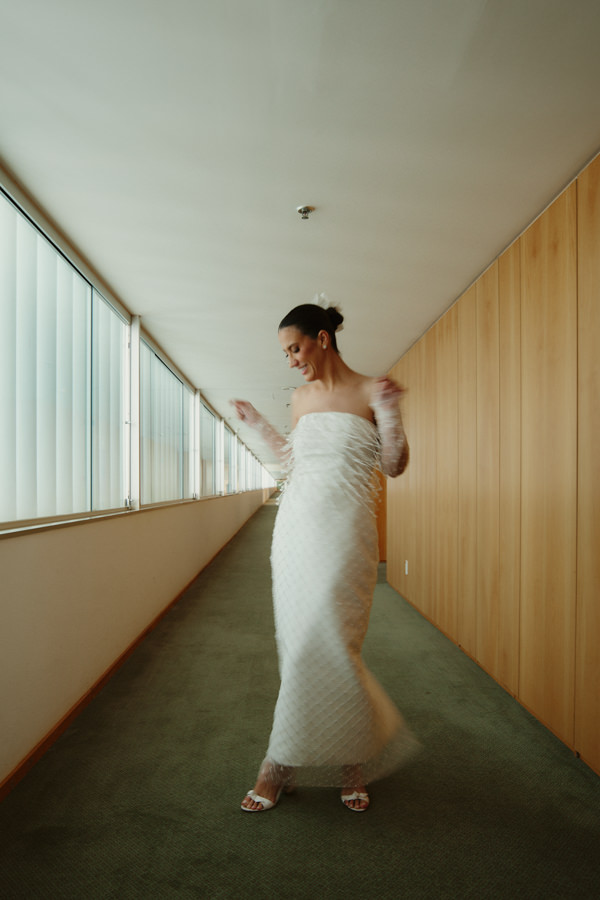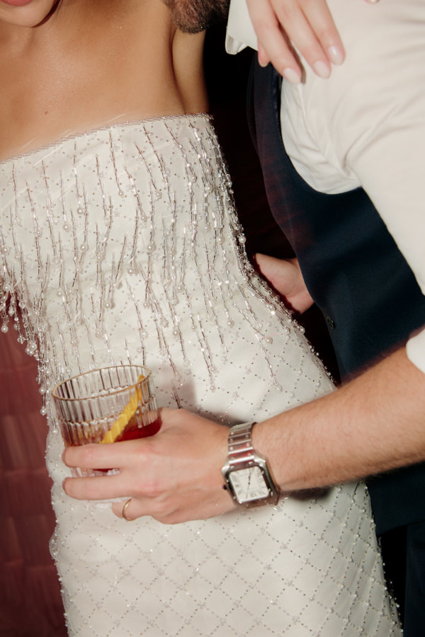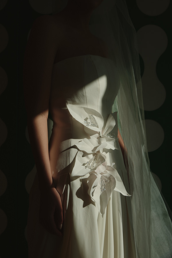 “O primeiro vestido tinha corte tomara que caia, cintura baixa assimétrica e trazia ainda um copo-de-leite confeccionado por um artesão da nossa equipe. Já o segundo foi inspirado nos anos 1920, com bordados feitos à mão e finalizado com luvas, reforçando a estética vintage que eu buscava.”