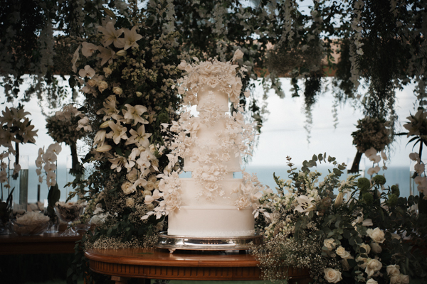 “A decoração foi idealizada por mim em cada detalhe e executada com perfeição pela AS2 Comadres. A paleta de cores seguiu inteiramente o branco e o verde, tendo o copo-de-leite como grande protagonista da igreja.