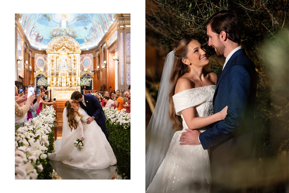 “Como já sabíamos qual seria o local da festa, queríamos uma igreja próxima para a cerimônia religiosa e assim facilitar o deslocamento dos convidados. A Igreja São Vicente de Paulo era a mais próxima e também a que comportava o número de pessoas que esperávamos. Acabamos optando por ela não só pela praticidade, mas também por ser uma igreja linda, que combinava perfeitamente com o momento.”