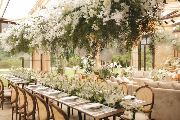 “Sempre sonhei com casamento tradicional. A escolha de todos os itens do casamento foi pensada e direcionada para esse estilo. Escolhemos uma paleta em tons de branco e verde, e utilizamos na decoração muitas orquídeas, rosas brancas, nuvens de gipsofilas (flor mosquitinho) e folhagens”, disse Ana Paula. No geral, a intenção “era que os convidados se sentissem em casa. Por isso, incluímos velas, aromatizadores, e porta-retratos com fotos nossas, em vários pontos.”