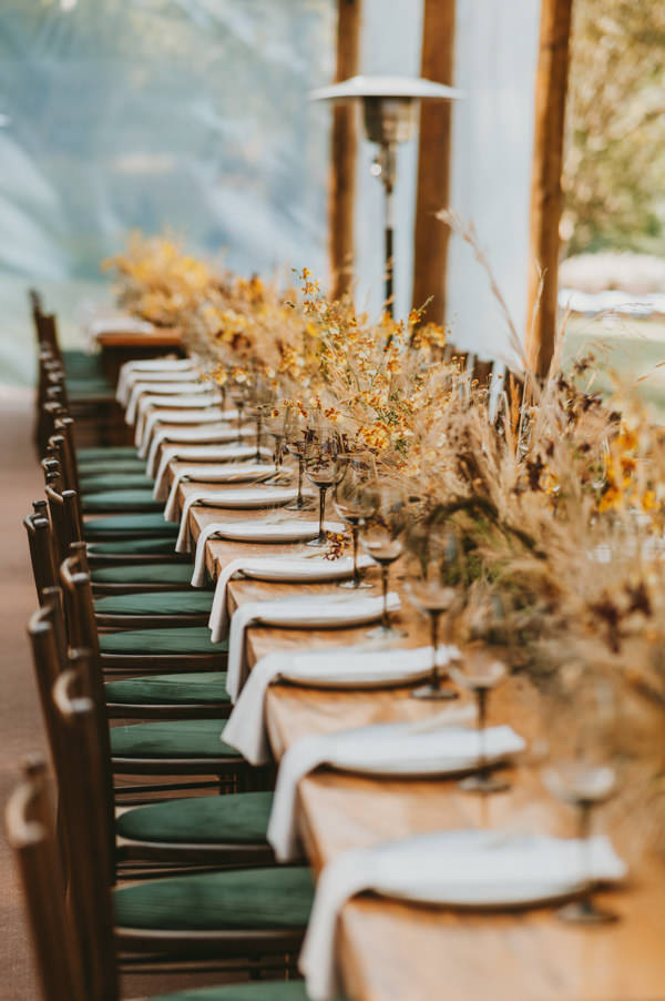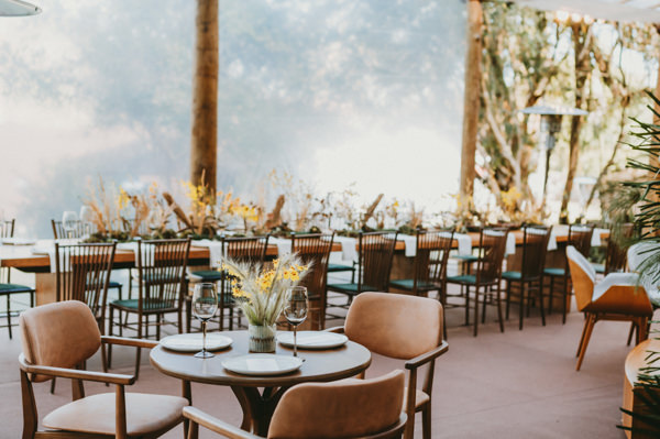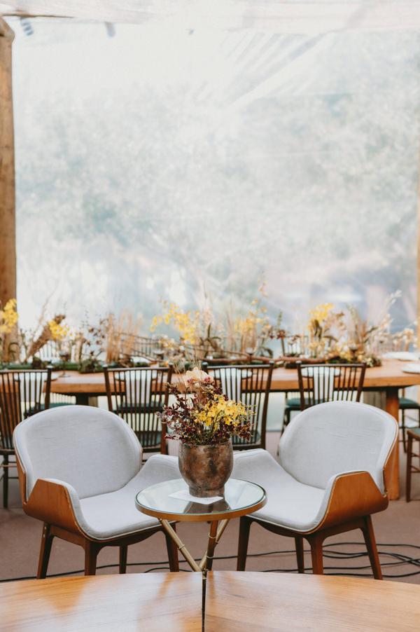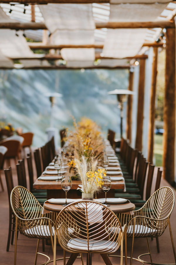 A decoração em tons terrosos foi assinada por Valter Braga, da VDesign. Foram usadas plumagens de capim em todo o caminho da noiva na cerimônia, assim como em curvas no altar. “O capim também marcou a festa com uma decoração aérea que fez todos os convidados se surpreenderem”, conta a noiva. Já na festa, arranjos florais com vários tipos de orquídeas em tons de amarelo, folhagem verde e seca decoravam as mesas comunitárias dos convidados. Nos lounges, mobiliário com formas curvas da 100% EventosGuia de Fornecedores