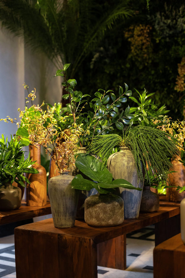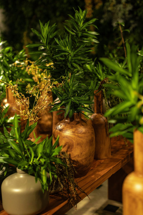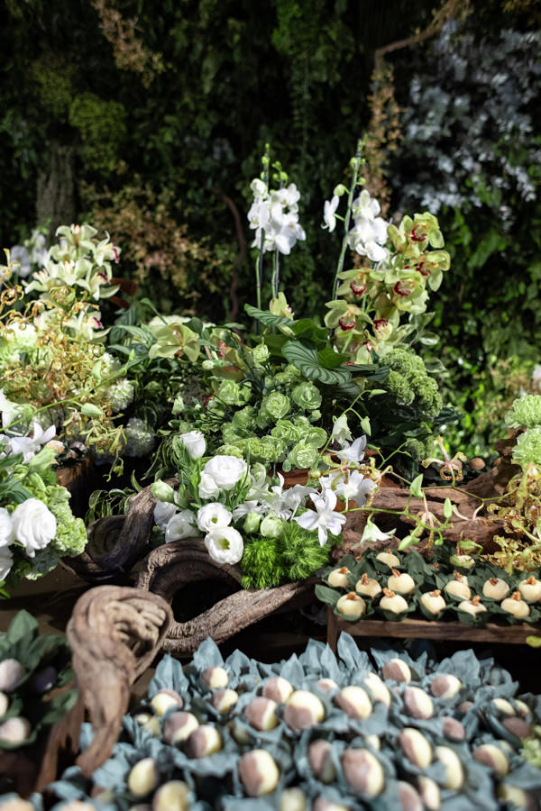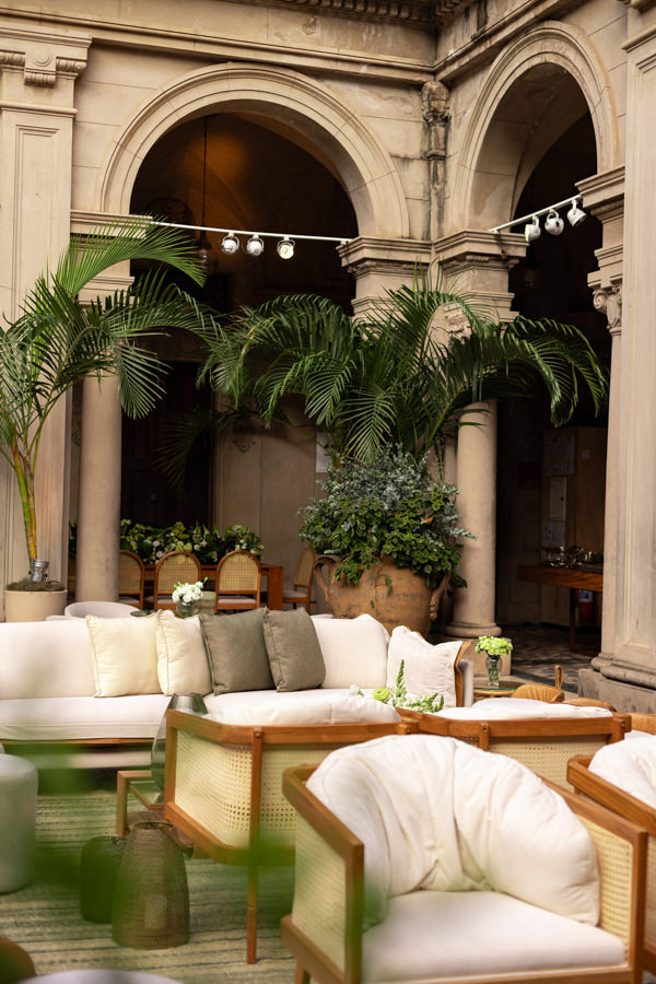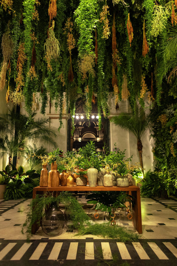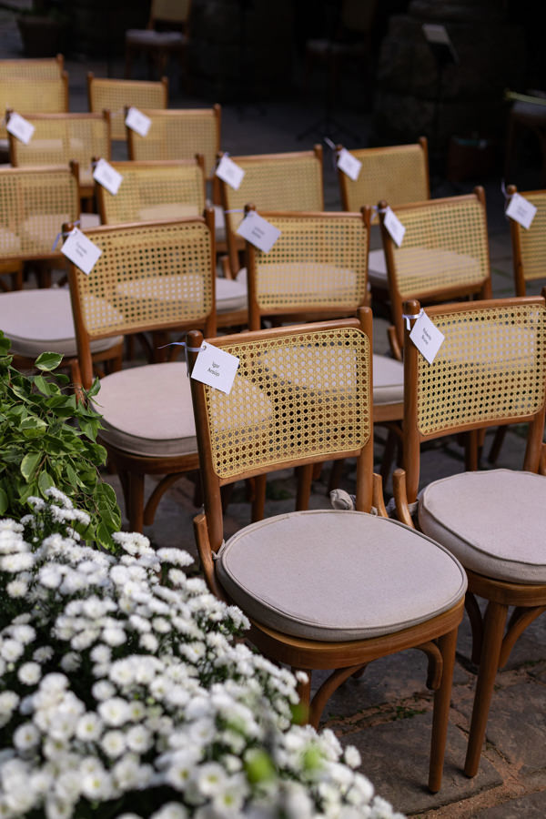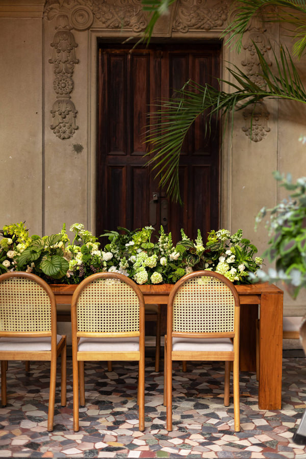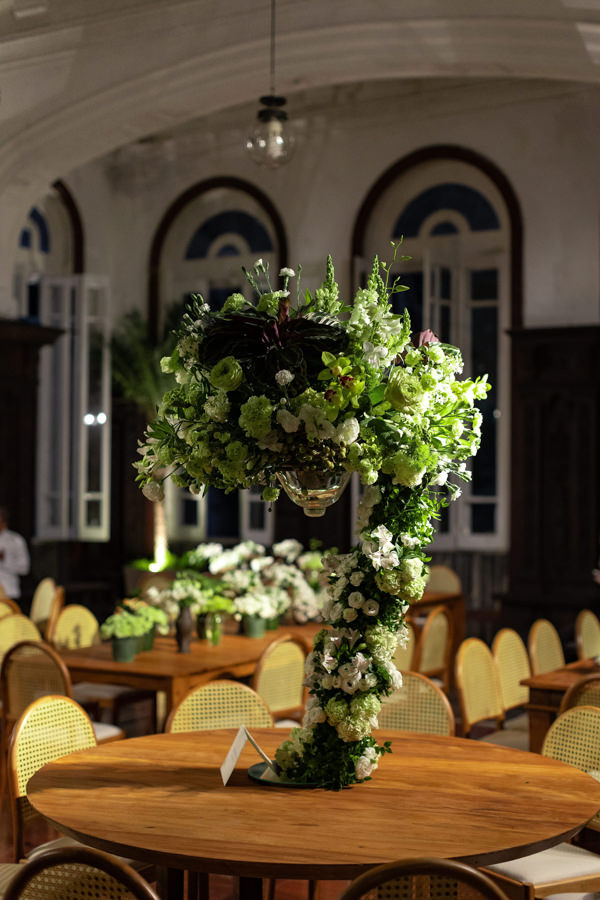“Queríamos uma decoração que valorizasse o local, a estrutura e o seu entorno. Um palacete histórico belíssimo, e seus arredores, também muito belo e muito verde. Preferimos, portanto, algo que se integrasse a esse ambiente, com predominância de folhagens (especialmente tropicais) e flores exóticas, porém discretas. Flores brancas para a cerimônia. Não queríamos nada muito colorido nem extravagante. Patricia Vaks conseguiu materializar tudo o que imaginamos com maestria.”