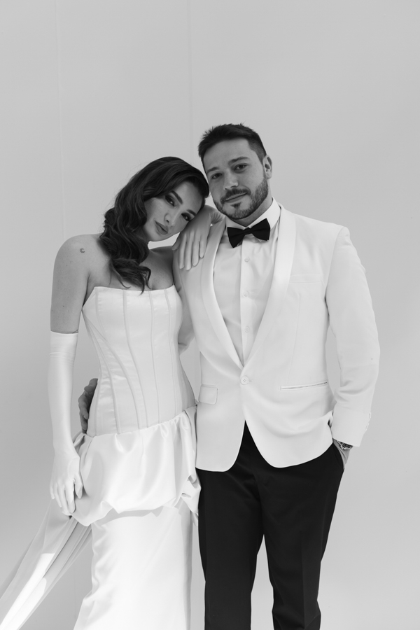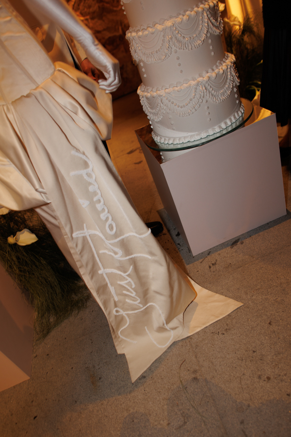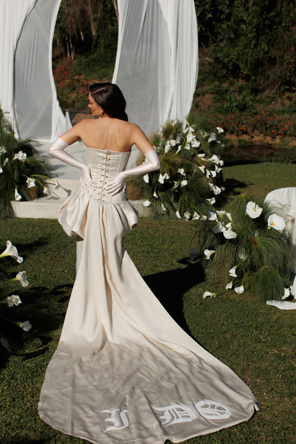 “O briefing era bem claro: um vestido que não fosse branco, com luvas, bordado com palavras e escritas significativas para o casal nas caudas (sim, foram duas!) e que pudesse se transformar ao longo da celebração, acompanhando os diferentes momentos da festa. Sempre achei uma peça especial demais para ser usada só na cerimônia e depois trocada. Queria que ele fosse único e estivesse comigo a noite inteira, do longo reto ao curtinho balonê, do salto à bota branca mais fashionista.”