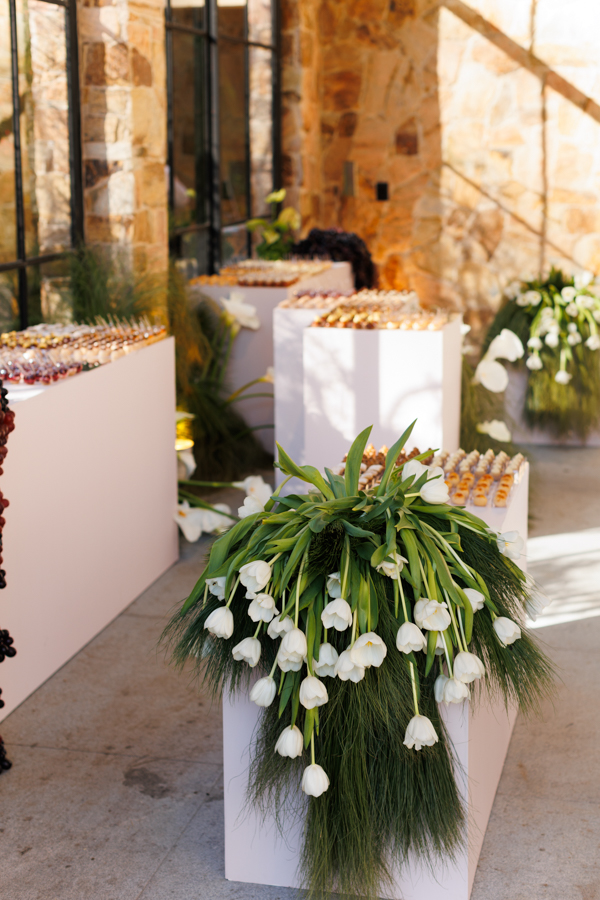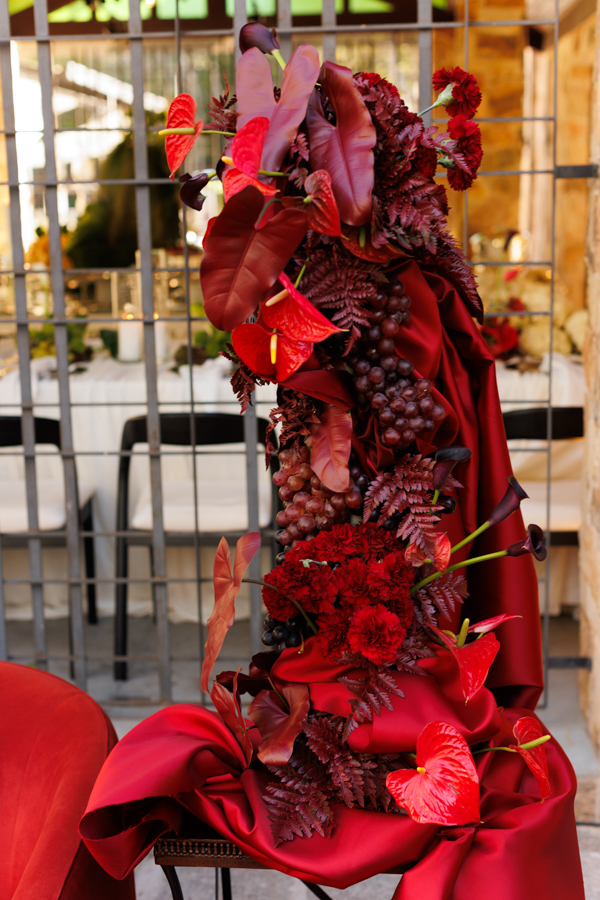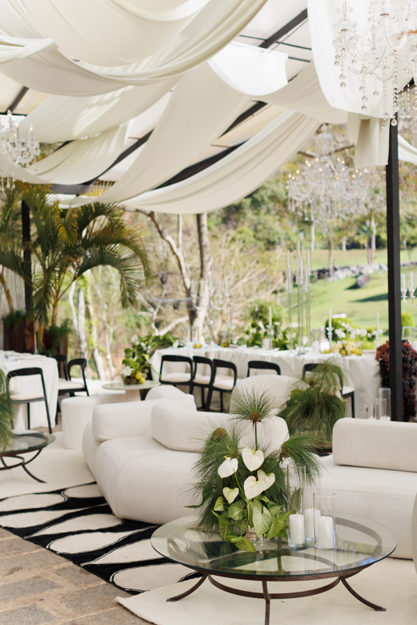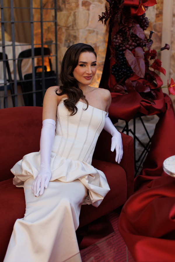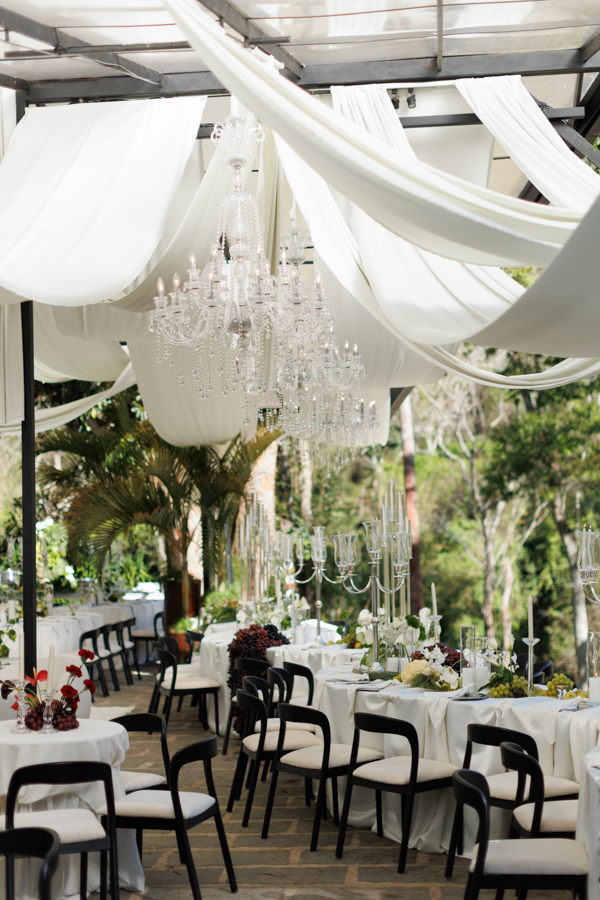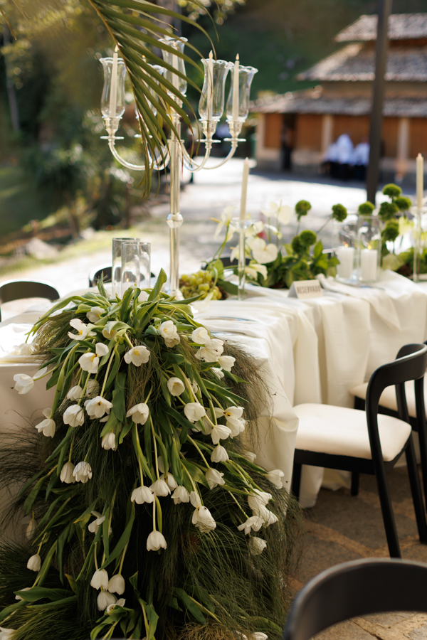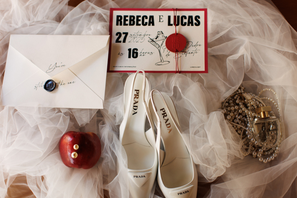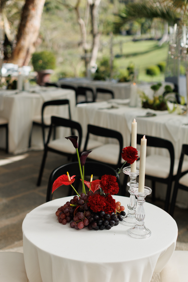 “Para a paleta de cores, sempre tive certeza de que o preto e branco seriam a base, até para contrastar com o verde da natureza ao redor. Mas, para trazer o “high”, queria uma cor vibrante que quebrasse expectativas e foi assim que surgiu o bordô. Desde que me conheço por gente, o vermelho é minha cor preferida, então não tinha como viver esse dia sem ele presente na paleta.”