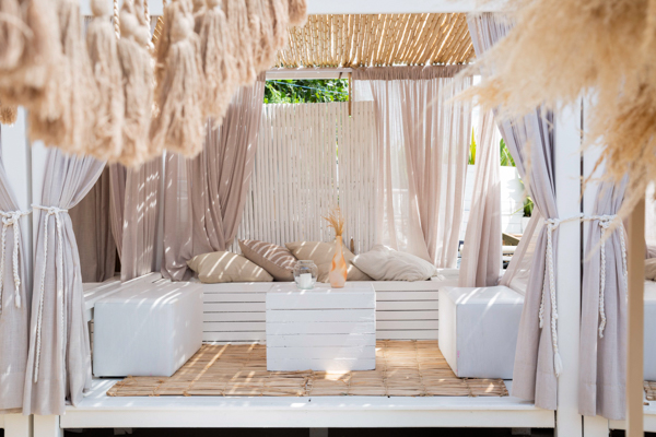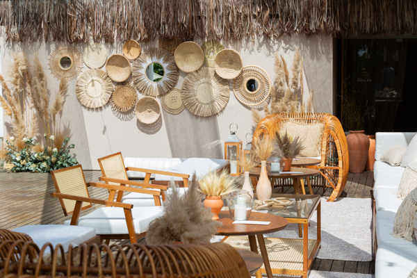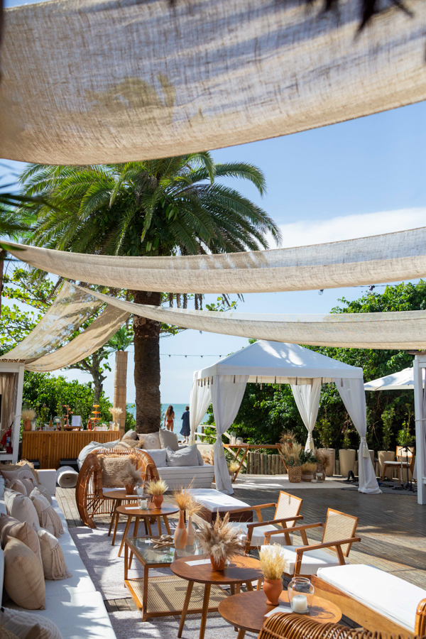 “Uma decoração despojada, com toques praianos, sem abrir mão da elegância que o momento pede. A proposta equilibra leveza, aconchego e romantismo, valorizando um espaço que já é naturalmente bonito“, conta Thai Pasin. “A neutralidade guia as escolhas, com o uso de móveis contemporâneos em madeira, que incluiram cadeiras pavão de vime na mesa comunitária, vasos de barro em diferentes tons, tecidos naturais e fluidos, além de elementos secos — como plumas, palhas e capins. As flores aparecem de forma sutil, quase inexistentes, dando lugar a um verde mais sóbrio, usado nos acabamentos e nas composições. O resultado é uma ambientação coesa, em perfeita harmonia com a praia”.