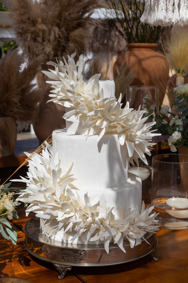 A paleta de cores da decoração seguiu a mesma linha conceitual: tons neutros e sóbrios, escolhidos para dialogar com o boho-tropical sem excessos. A combinação criou um cenário harmonioso, onde cada detalhe encontrou espaço para se destacar com equilíbrio e coerência estética.