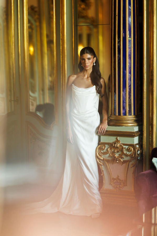 “Algum tempo depois, voltei a Paris com minha mãe e minha irmã para revisitar alguns dos ateliês e, pela primeira vez, conhecer o da Vivienne Westwood. Foi o primeiro que visitamos juntas e, no instante em que provei o vestido, elas olharam para mim e disseram: “É esse!” — e não restou nenhuma dúvida de que havia encontrado o certo. Nenhum outro vestido que experimentei depois causou o mesmo impacto.”