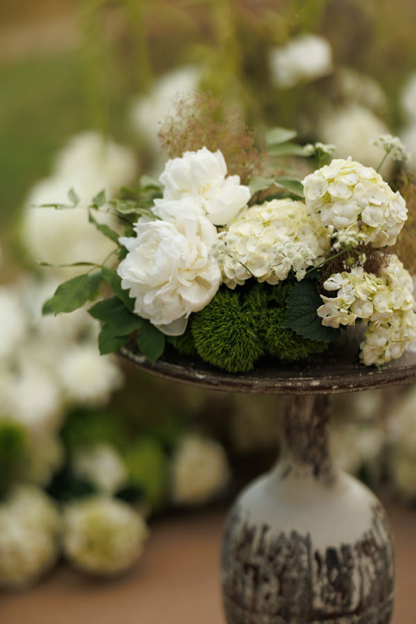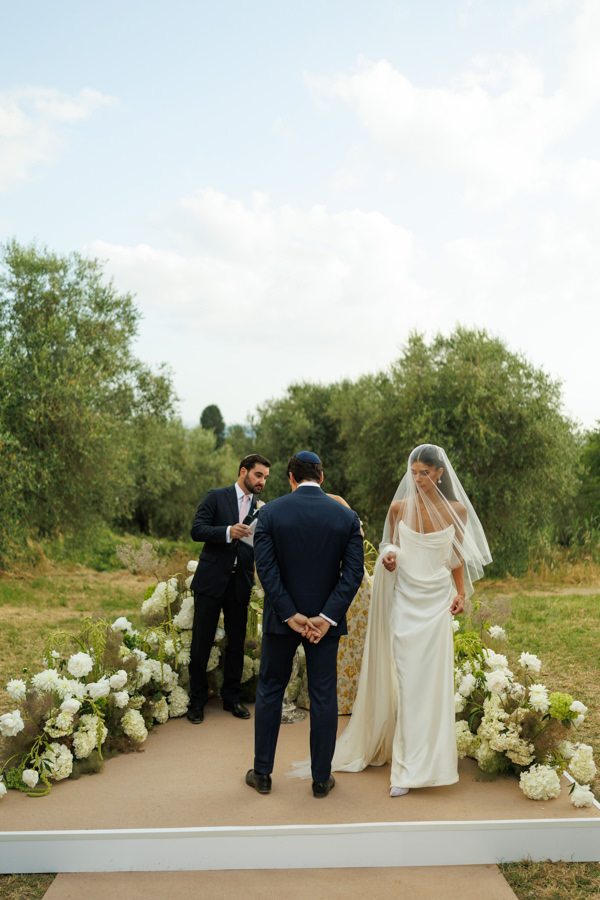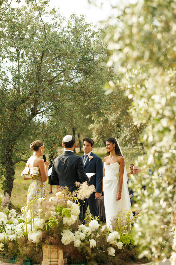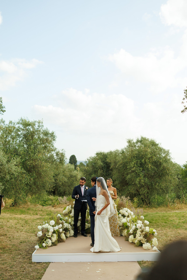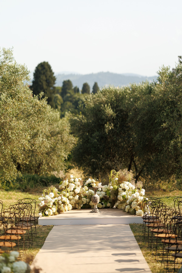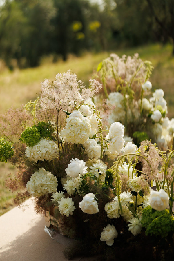 “Para a cerimônia, escolhi uma paleta em tons de verde e branco, para que se integrasse ao cenário das oliveiras e criasse uma atmosfera harmônica e natural. No aperitivo, optamos por arranjos em branco, verde e rosa, trazendo leveza e delicadeza.”