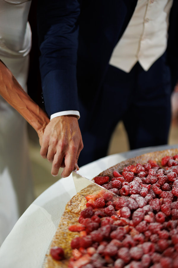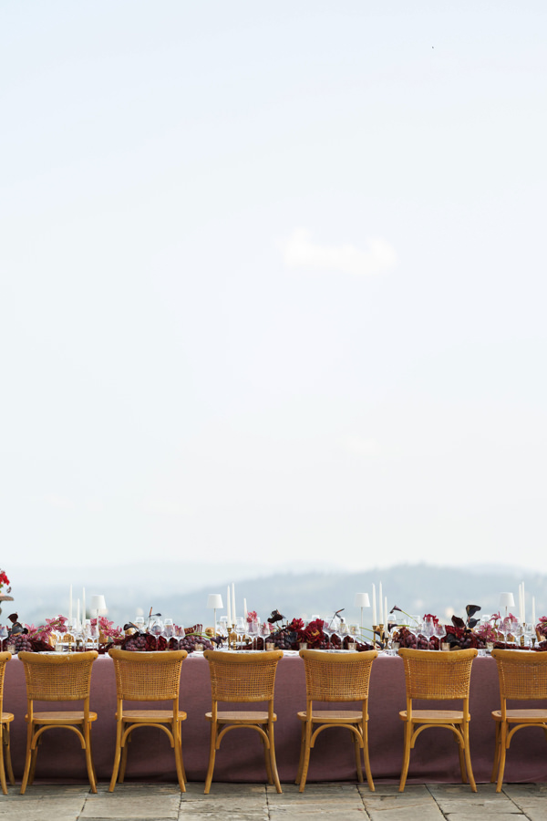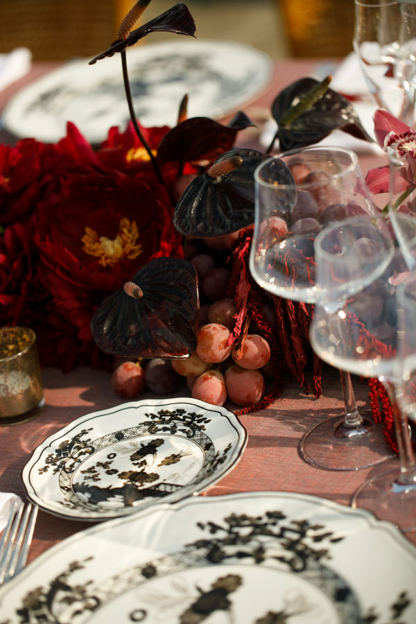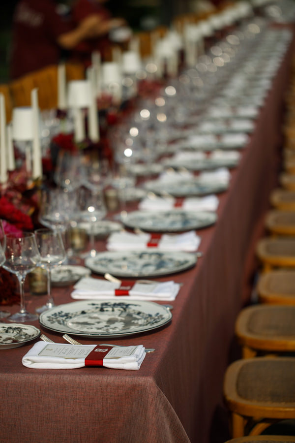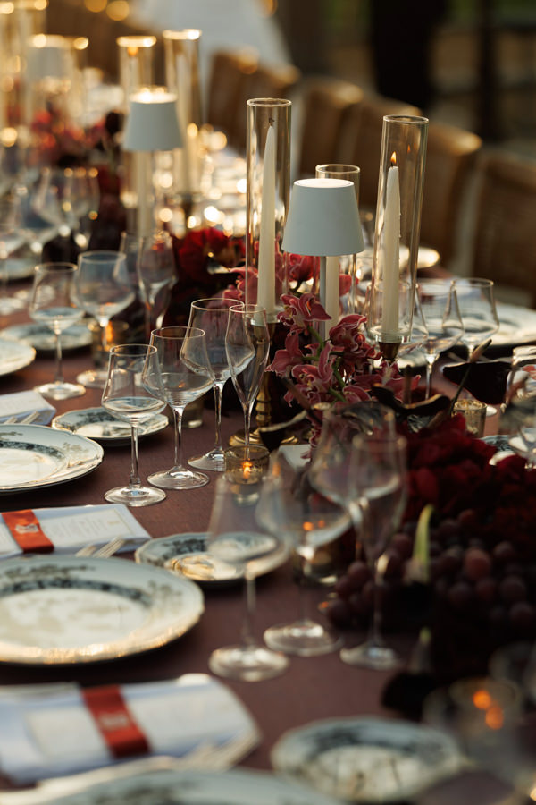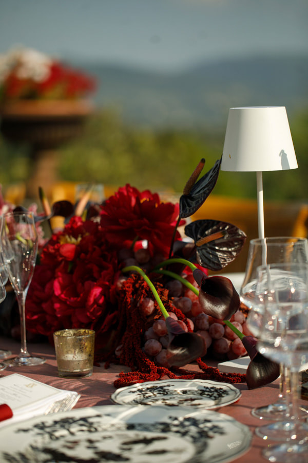 “Mas foi na festa que quis realmente ousar: queria algo impactante, moderno e diferente. Por isso, escolhi a cor Black Cherry como destaque da decoração. Nunca me imaginei tendo um casamento repleto de flores — não faz parte do meu estilo —, então preferi valorizar a beleza do local e misturar flores com vegetais e frutas, o que trouxe autenticidade e personalidade à decoração. Tivemos uvas, radicchio e berinjelas lado a lado com peônias, amaranthus, dálias e antúrios, criando uma combinação única.”