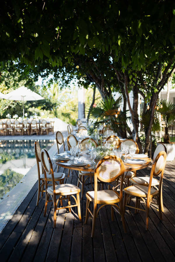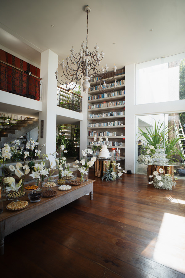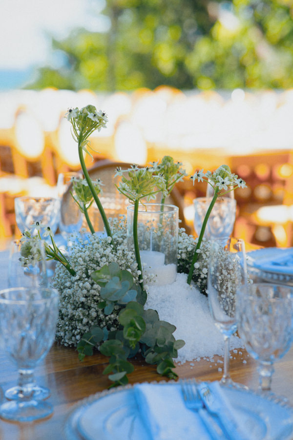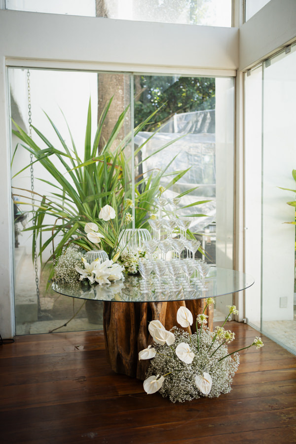 “A paleta em verde e branco foi escolhida com cuidado, e DM Decor, que assinou a decoração, captou perfeitamente essa essência, criando uma ambientação sem mascarar a beleza natural do local, escolhido justamente por já ser uma locação deslumbrante. Velas e iluminação cênica fizeram toda a diferença na composição.”