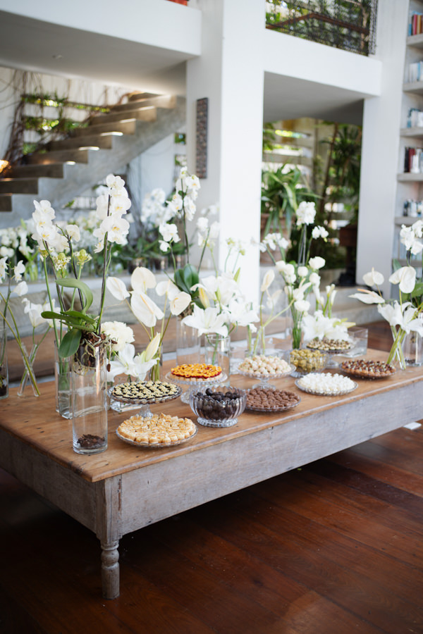 “Para a decoração, o próprio espaço pedia pouco. Por isso, optamos por priorizar a qualidade em vez da quantidade, direcionando a escolha das flores e dos elementos decorativos com esse olhar. Usamos flores nobres, como orquídeas. Algumas delas, inclusive, seguem até hoje no jardim da minha sogra, sempre trazendo à tona essa lembrança especial.”