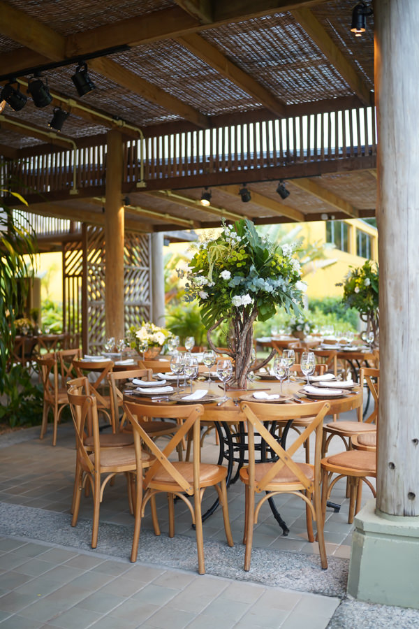 “Escolhemos o estilo mais contemporâneo, apesar de estarmos na Bahia, no ar mais praiano e calor. A paleta da decoração seguiu no branco e verde nas flores e vegetação, móveis em madeira e elementos característicos da região. “