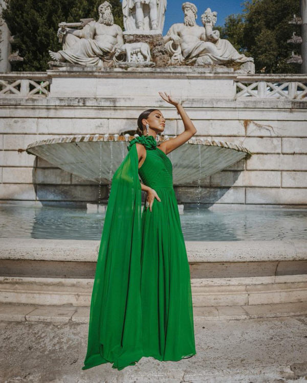 Victoria Hamuche apostou em um vestido de um ombro em crepe de seda com maxiflor no ombro, em Roma: