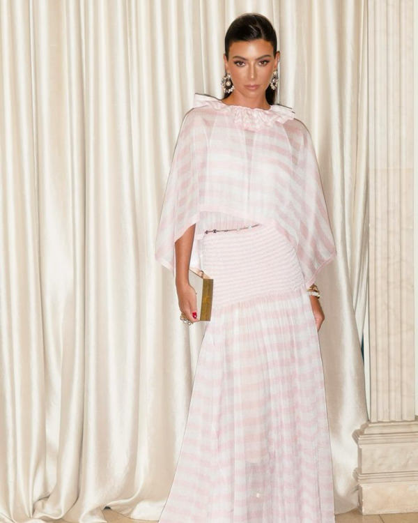 A influencer usou um Chanel listrado com lastex nas ancas e capelet de gola com babados: