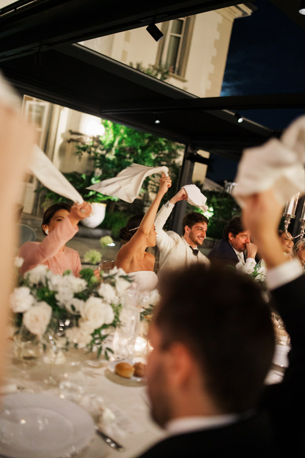 “Queríamos uma atmosfera romântica e clássica, com muitas flores brancas, especialmente hortênsias e rosas, e velas, criando um clima leve e acolhedor. A escolha da paleta da decoração foi muito intuitiva: optamos por diferentes tons de verde, do oliva ao menta, combinados ao branco. A decoração foi assinada pela Il Profumo Delle Rose.”