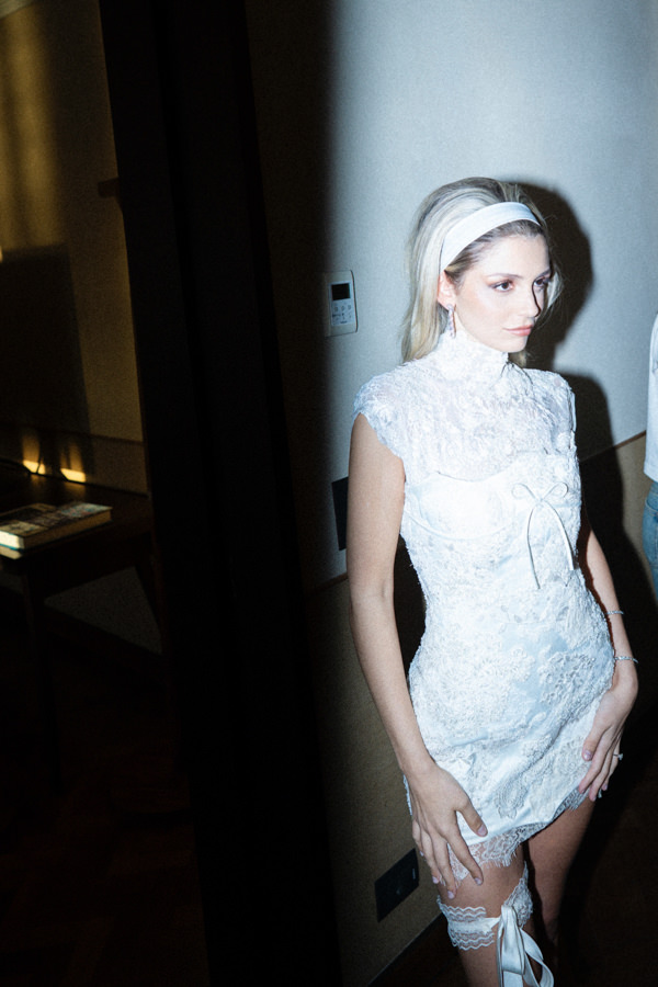 A noiva se encantou por um mini dress vintage da Versace que viu durante a semana de moda de Paris e foi naquela hora que teve certeza do estilo de vestido que queria para o welcome party. “Chegamos até a subir mais a barra e colocar uma rendinha embaixo para deixá-lo ainda mais curto. Falei para Rebecca: ‘faz o que você sabe fazer de melhor, vamos pirar nas rendas!’ E foi isso. Criamos um vestido romântico, mas com uma pitada sexy, porque a perna fica bem à mostra e a renda dá esse contraste delicado e sensual ao mesmo tempo. Ele é todo trabalhado em renda, tem brilho, tem um lacinho (porque amo laço, é meu lado menininha), mas ainda assim é super sexy. Atrás, ele é transparente com botõezinhos – um charme!”, compartilha.
