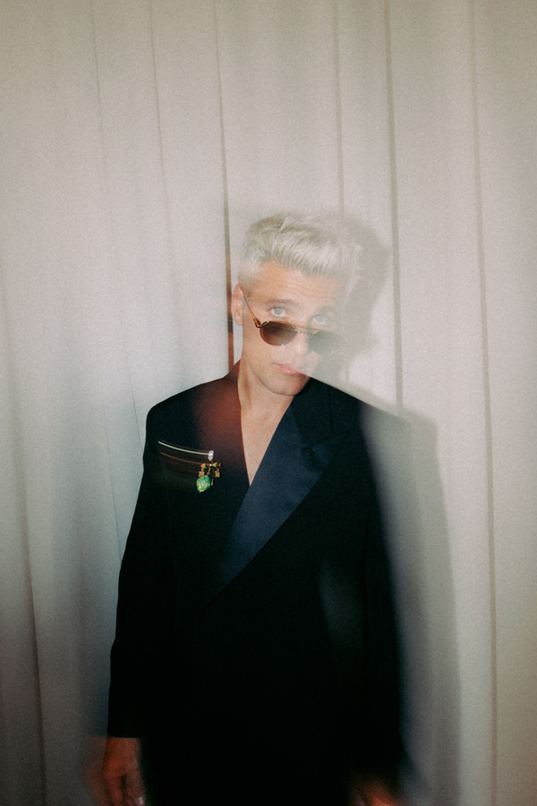 Bruno usou um traje, assinado por Wales Bonner, que levou um detalhe especial: o broche com as contas pintadas à mão por artesãos de Gana.