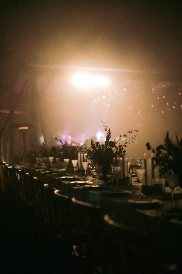 Para a decoração, os noivos queriam algo clean, com uma atmosfera de Toscana e beleza na simplicidade. Assim, Museu de Grandes Novidades, que assinou a decor, optou por longas mesas comunitárias em materiais naturais e orgânicos, onde a mesa posta incluiu velas, toalhas de mesa longas e arranjos florais inspirados em arranjos ingleses campestres.